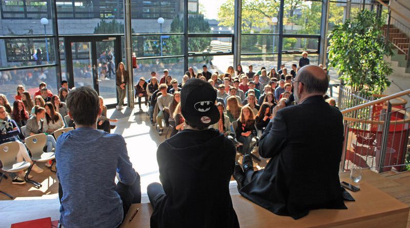 Er stellte sich in Form einer Podiumsdiskussion den Fragen der neunten Klasse. Geleitet wurde die Diskussion ausschließlich von Schülern.