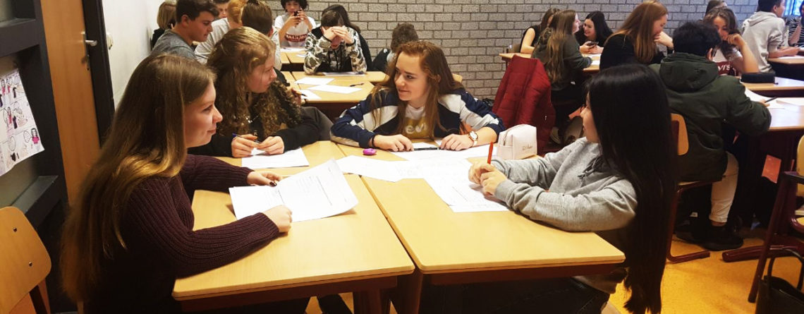 Der erste Tag war dem Kennenlernen und der Einführung ins Thema gewidmet. Überraschend zunächst einmal der Rundgang durch die moderne, bunte Schule in Brunssum. Jedes Schulfach hat einige feste Stammräume. Und so saß dann die Gruppe umgeben von Berlin-Postern, Faustregeln zur Deklination deutscher Substantive und Porträts berühmter Deutscher und Österreicher in den beiden Fachräumen für Deutsch. Alle Schülerinnen und Schüler waren in feste Fünfergruppen für die ganzen vier Tage eingeteilt, um das Kennenlernen zu erleichtern.