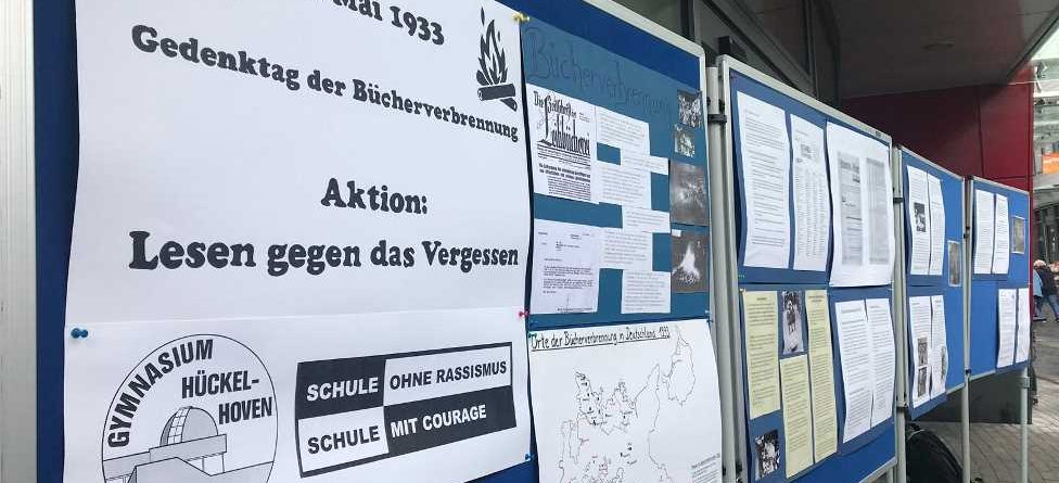 Vorbereitet wurde diese Veranstaltung unter Leitung von Christine Wolff zusammen mit Bettina Jansen, Birgit Fluhr-Leithoff und Maximilian Seidel als Mitglieder der Teilkonferenz Schule ohne Rassismus und Vertretern der Gruppe Pax Christi mit Hans Jürgen Knubben und Bruno Bürger. Es wurden Texte und Kurzbiographien von bekannten Autoren wie Heinrich Heine, Erich Kästner, Bertolt Brecht, Franz Kafka, Else Lasker-Schüler, Stefan Zweig, Karl Marx, aber auch weniger bekannten Dichtern wie Max Herrmann-Neisse, David Luschnat, Lion Feuchtwanger, Jakob Wassermann oder Charlotte Temming zusammengestellt, die dann von verschiedenen Mitwirkenden vorgetragen wurden. Insgesamt kamen so rund vierzig Leser/innen zu Wort, so dass dadurch die große Vielfalt der Texte besonders zum Ausdruck gebracht wurde. Es waren von unserem Gymnasium vor allem Schüler/innen der Jahrgangsstufe 9 und der EF, aber auch etliche Lehrer, die sich beim Vortragen engagierten. Die Pax Christi-Gruppe brachte mit verschiedenen Personen Texte von Erich Kästner, Egon Erwin Kisch und Kurt Tucholsky zu Gehör. Dazu gehörte auch das Pastorenpaar Ute und Gerhard Sass, ebenso wie der Landtagsabgeordnete Thomas Schnelle, der nicht nur die Veranstaltung besuchte, sondern spontan einen Text vortrug. Außerdem beteiligte sich Nuran Joerissen an der Lesung, die als Patin für Schule ohne Rassismus – Schule mit Courage einen ganz besonderen Bezug zu unserer Schule hat.