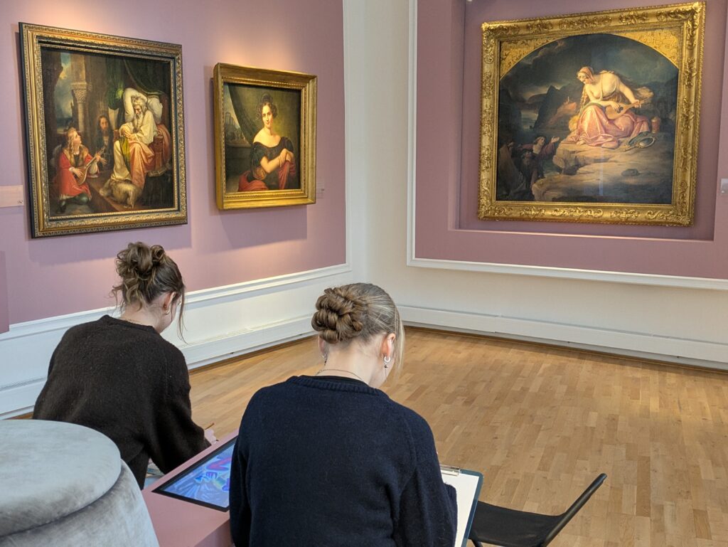 Nachdem sie im Atelier erfahren hatten, wie eine typische Künstlerwerkstatt zur Zeit Carl Josef Begas aussah und wie Künstler im 19. Jahrhundert ausgebildet wurden, betrachteten die Schülerinnen und Schüler ausgewählte Porträts in den verschiedenen Räumen des Begas Hauses. Die besprochenen Werke umspannten die Epoche zwischen Aufklärung, Romantik und Biedermeier bis zur Wilhelminischen Kaiserzeit.