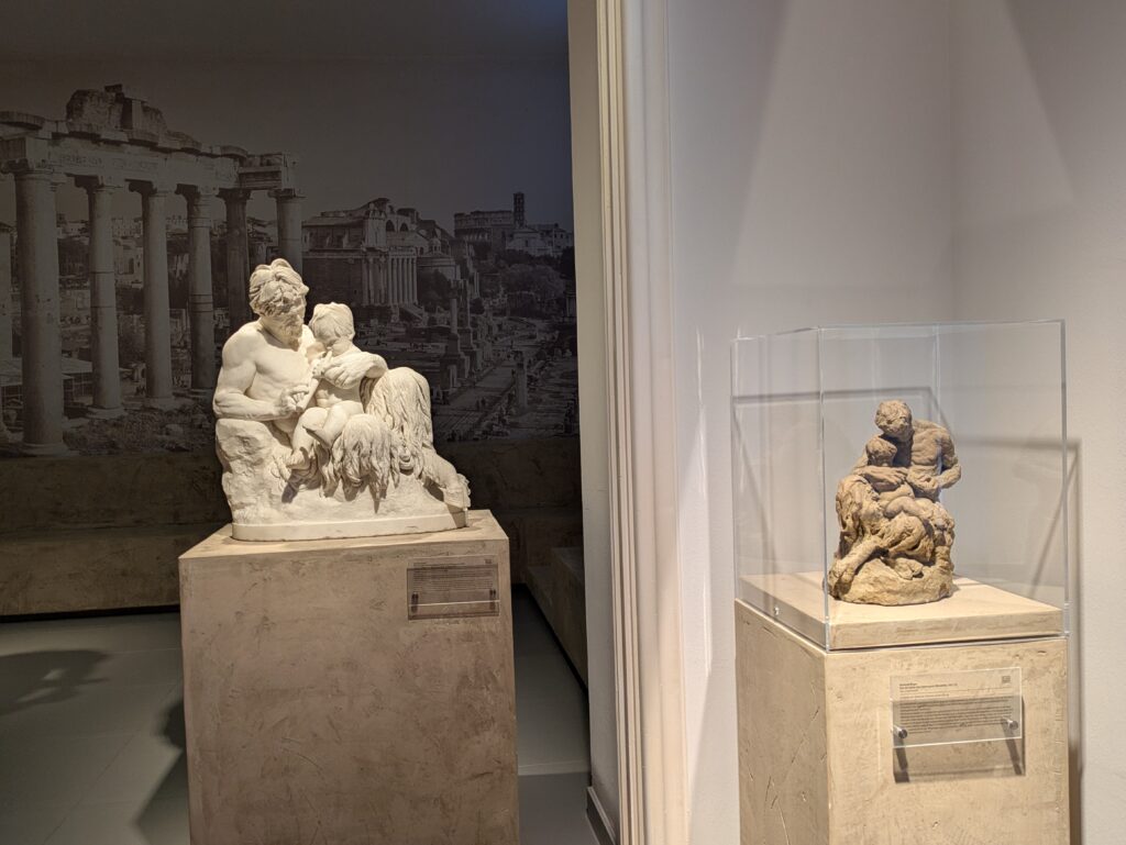 Großes Interesse wurde auch an der Skulptur „Pan als Lehrer des Flötenspiels“ von Reinhold Begas aus dem Jahr 1868 gezeigt. Aufmerksam hörten die Schülerinnen und Schüler Frau Dr. Tichelmanns zu, die ihnen erläuterte, dass der römische Dichter Ovid in seinen Metamorphosen berichtet, dass die Nymphe Syrinx aus Furcht vor den Nachstellungen des bocksbeinigen Naturgottes Pan die Götter um Hilfe anflehte und daraufhin in ein Schilfrohr verwandelt wurde. Der Verschmähte schnitzte sich aus dem Rohr eine Flöte, die seither als Syrinx oder Panflöte bekannt ist. Beeindruckt zeigten sich die Schülerinnen und Schüler vor allem davon, wie es Begas gelungen ist, die Adern unter der Haut zu verdeutlichen und wie realistisch das Fell des Bocks wirkt. Da auch ein Bozzetto zu dieser Skulptur ausgestellt war, konnten auch der Entwicklungsprozess der Skulptur vom Tonmodell zur Marmorskulptur nachvollzogen werden.